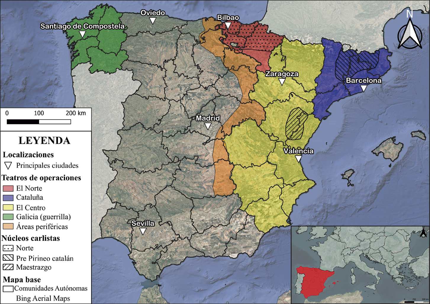 Figura 1. Mapa de España con indicación de los principales territorios afectados por las guerras carlistas
