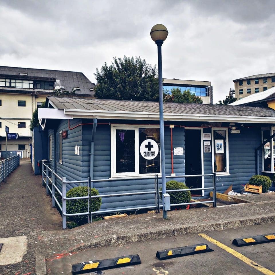 Cuando las/os futuras/os brigadistas entrevistadas/os deciden salir a las calles en contextos de estallido social, la Brigada Cruz Negra ya había aparecido en las manifestaciones, no obstante, aún no tenía nombre fijo, y se denominaba: “brigada primeros auxilios Temuco”, “brigada de enfermería” y “brigada primeros auxilios UFRO”, nombres que permiten dar cuenta de los rasgos distintivos de este primer periodo de la brigada: primeros auxilios, enfermería, Universidad de La Frontera (UFRO). Así, según los relatos, la brigada surge al inicio del estallido social en Temuco como una iniciativa de estudiantes de enfermería y medicina de la UFRO. Estas/os se ubican en la Facultad de Medicina de la UFRO, frente al Hospital Hernán Henríquez Aravena y frente a la Plaza del Hospital, epicentro recurrente de la represión policial y el enfrentamiento de los manifestantes con las fuerzas especiales en las manifestaciones del estallido social, dispuesta a un par de cuadras del centro de Temuco. Dentro de la facultad, la brigada hace uso especialmente del estacionamiento, y dos construcciones: la “casita de salud” y el “edificio SB” (figuras 1 y 2).