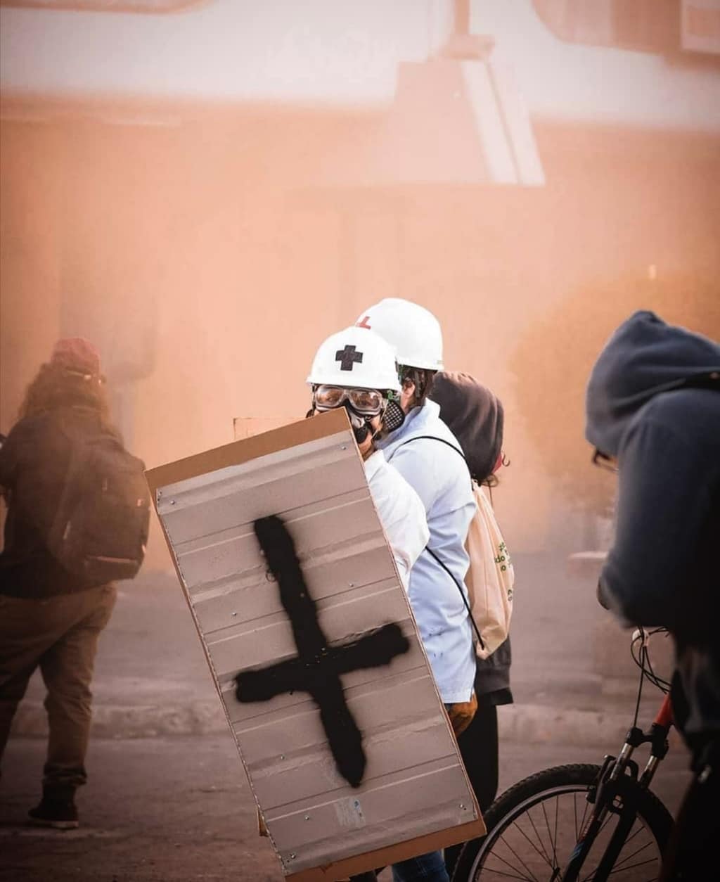 El primer objetivo fue prestar ayuda de primeros auxilios en salud, que en el fondo surge a partir de la necesidad de apoyar a las personas que estaban en situación más vulnerable frente a la violencia y represión por parte de la policía, de fuerzas especiales, de carabineros y militares en las manifestaciones […]. Ayudar a la gente que estaba gaseada, ayudar a la gente que la había mojado el carro lanza agua, la gente herida por perdigones. (Gladys, brigadista Cruz Negra, entrevista con el autor, 4 de mayo de 2020)