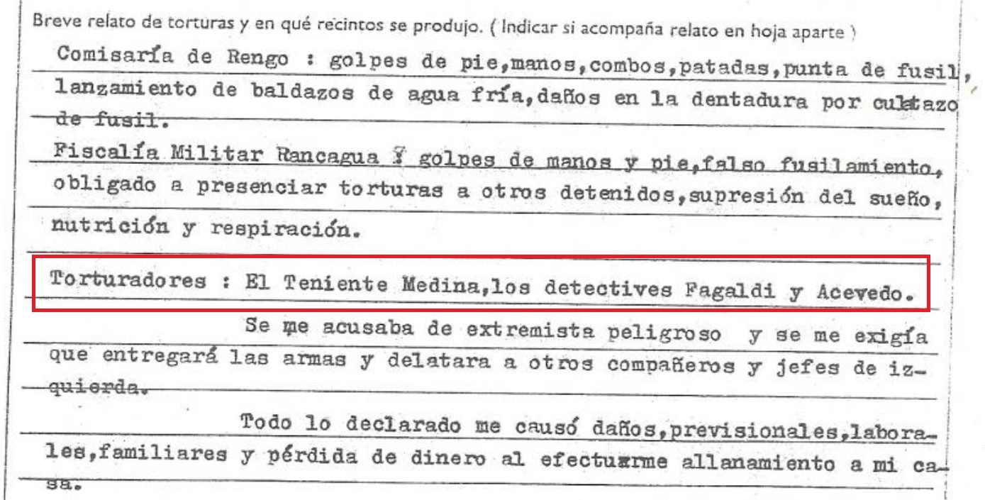 Benito del Carmen, declarante de la Valech 1, adjuntó un testimonio sobre su experiencia de detención durante 1975 en cinco recintos de reclusión. Uno de ellos es la Fiscalía Militar de Rancagua, o Fismil, como indica su Ficha de ingreso. Desde la cárcel de mujeres El Buen Pastor fue conducido junto con otro prisionero,