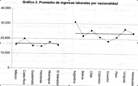 Para los emigrantes centroamericanos, los porcentajes correspondientes son 15% y 40% (Banco Mundial 2003, p. 20). En el mismo sentido, el Gráfico 2 muestra que la diferencia en el ingreso promedio entre los emigrantes suramericanos y los centroamericanos supera los siete mil dólares anuales.