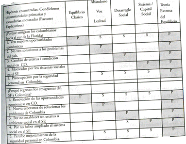 Tabla 1 Hipótesis encontradas de las teorías migratorias antagónicas para explicar la migración de las clases media y media - alta colombiana hacia el sur de la Florida (1996-2002) (P) condición primaria, con pruebas. (S) condición secundaria con pruebas. Siglas: Colombia (CO), Sur de la Florida (SF), ambiente (amb.).Diseño de la investigación.