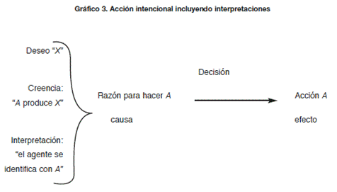 Primero, no incorpora con claridad el papel de las interpretaciones como componentes de las razones, puesto que el valor de utilidad y las probabilidades sólo representan deseos y creencias sobre la estructura causal de la situación. Las interpretaciones son un tercer componente de las razones en la medida en que representan la identificación del agente con sus propias acciones; es decir, reflejan la visión del agente sobre si tal o cual acción disponible es algo que él haría.