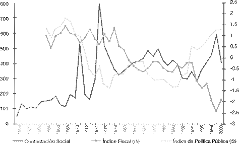 La Figura 2 muestra las series de protestas sociales y el índice de capacidad ciudadana. Las capacidades ciudadanas crecieron gradualmente entre 1970 hasta 1990, y llegaron a su punto más alto entre los años 1991 y 1994. Varios factores explican el aumento de las capacidades ciudadanas: primero los avances socioeconómicos que aumentaron la esperanza de vida al nacer de la población[16], segundo la implementación gradual de políticas que optimizaron la relación entre el gobierno y los ciudadanos, y finalmente, el acrecentamiento del empleo en el estado, la urbanización y el desarrollo de industrias en algunas regiones mejoraron las posibilidades de asociación de los ciudadanos en la medida en que un número mayor de personas trabajaban y vivían en condiciones más organizadas y más susceptibles a las regulaciones del estado.