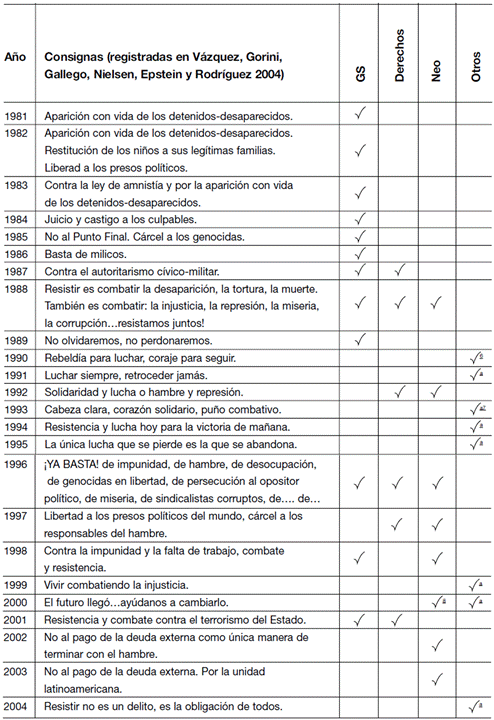 Tabla 1. Consignas de la Marcha Anual de Resistencia, 1981-2004