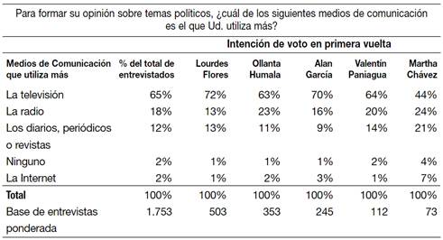 El electorado peruano, al menos en lo que toca a zonas urbanas, ha venido formando su opinión política, mayoritariamente, mediante la televisión y mucho menos por la radio o los diarios. Así parece haber ocurrido también en el reciente proceso electoral. Según una encuesta preelectoral de la Universidad Católica del Perú (2006), el 65% lo hace de ese modo y el 18% toma como referente la radio (Ver Tabla 2). Como hace muchos años, al menos desde los años 80, es la televisión la que acapara la función informativa respecto del electorado y por donde pasan con mucho las influencias que más tarde han de convertirse en votos concretos a favor de uno u otro candidato. Como ha sido anotado por Tanaka (1998), el espacio de los medios, especialmente la televisión, es la arena por excelencia de competencia electoral que permite los triunfos o las derrotas, muy por encima del ámbito del movimiento social y las organizaciones gremiales. Si bien es cierto que el uso de medios depende de la capacidad económica de los partidos y de una estrategia de mercadeo político precisa, la primera vuelta de este proceso se caracterizó porque éstos favorecieron la candidatura de Lourdes Flores contra Ollanta Humala y el propio Alan García. Lo mismo ocurrió con este último, quien recibió el beneficio en segunda vuelta y contra Humala, de las más importantes compañías de televisión y radio.