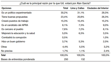 Pero sobre el triunfo de Alan García es posible todavía refinar más el análisis. A partir de los datos de la encuesta de opinión muy próxima a la segunda vuelta, realizada por el Instituto de Opinión Pública de la Pontificia Universidad Católica del Perú, el triunfo de Alan García se podría explicar, aparte de unas particulares circunstancias que se confabularon a su favor, por ser un político ‘experimentado’; aunque se debe resaltar el hecho que una razón también fuerte para votar por él fueron sus propuestas (Ver Tabla 10). Además, pese a su pasado, García es asociado con la democracia, observación que no sorprende, pues siendo presidente de 1985 a 1990, respetó las reglas de juego básicas de este sistema y convocó a nuevas elecciones al final de su mandato (Ver Tabla 11). El recuerdo de su política económica “heterodoxa” con la nacionalización de la banca y el rechazo al pago de la deuda externa, que le significó al Perú una caída fuerte a nivel real, con un promedio de -1% en el período presidencial, acompañada por una inflación promedio de 1.979,01%, no fue un factor decisivo o que hiciera peligrar su triunfo. Alan García recibió el apoyo tanto de Lima como del resto del país en la segunda vuelta.