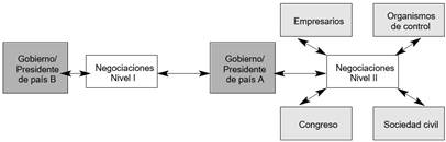 Ese modelo es el “juego de dos niveles”, elaborado por Robert Putnam. Es un marco teórico que muestra las conexiones entre diplomacia y política doméstica en negociaciones internacionales, señalando especialmente el papel que cumple el gobierno nacional, pues éste, para lograr que el tratado sea políticamente viable, debe lidiar al mismo tiempo tanto con los negociadores del otro país como con los actores internos para garantizar su legitimidad.