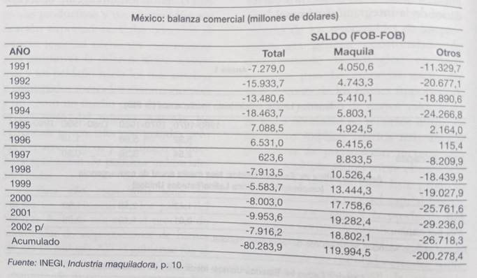 Las empresas exportadoras son pocas y están desconectadas del resto de la economía, no tienen arrastre sobre sus cadenas productivas ya que prácticamente todo lo importan, son islas exitosas en un país estancado. Casi la mitad (45%) de las exportaciones son maquila… Otro 42% de las exportaciones son manufacturas no maquiladoras, que incluyendo la mano de obra tienen aproximadamente 30% de contenido nacional. Solo 13% de las exportaciones tienen alto contenido mexicano (petróleo, metales y agropecuarias). (2003: 17)