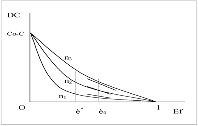 El término n entrega al ente regulador la medida en que considere que la ineficiencia pesa en la reducción de las tarifas. Si se desea que la tasa de eficiencia sea severa en la reducción de tarifas, se escoge un n cercano a 1; por el contrario, si el objetivo es una penalización más laxa, se asume un n mucho mayor que 1. Por ejemplo, para un θo específico mayor que θ*, donde n1 > n2 > n3, entonces d(DC)1 / dEf < d(DC)2 / Ef < d(DC)3 / Ef (ver la gráfica 3).