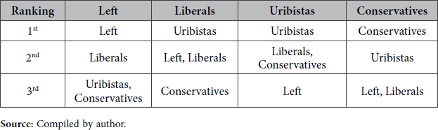 The ordering summarized in Table 2 is consistent with an ideological alignment that positions the Conservatives on the right, the Uribistas on the center-right, Liberals spanning from the center to the center-left, and the Leftist group on the left pole. The results also exemplify the lack of team-like behavior among the Liberal group.