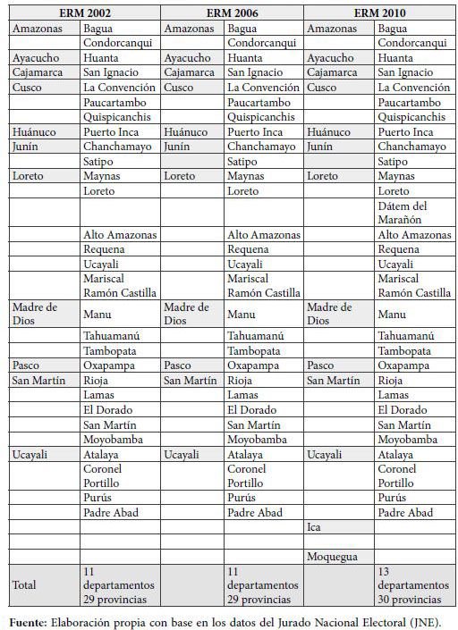 El cuadro 2 muestra que en el período señalado, los cambios se produjeron únicamente en el proceso de 2010, y se centraron en la adición de dos departamentos y una provincia. Recuérdese que las normas disponen que el JNE determina las zonas donde se aplica la cuota, ahí donde existieran comunidades nativas, comunidades campesinas y pueblos originarios. Tomando en cuenta que el Estado peruano está dividido política y administrativamente en veinticuatro departamentos, ¿debe entenderse entonces que en 2002 y 2006, en trece departamentos del país no existían dichos colectivos, pero en 2010 solo eran once los que carecían de ellos?