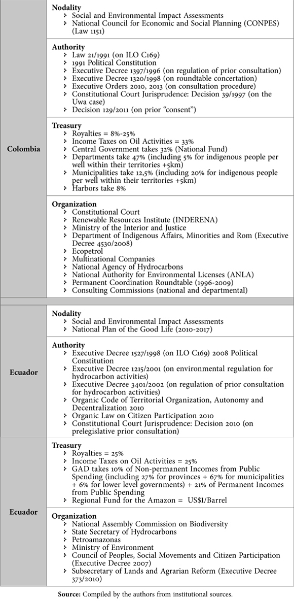 Finally, the instruments of nodality are similar in both countries. They include social and environmental impact assessments, which have been institutionalized for the past two decades through environmental policies. In practical terms, these assessments include the right of local communities (including indigenous peoples) to be informed about the risks involved in oil and gas activities, to monitor the management of the environment, and to obtain reparations and indemnities for negative impacts such as contamination, violation of territorial integrity, and damages to private property. Moreover, development planning in both countries is subject to social control by local populations. The National Council for Economic and Social Planning in Colombia and the National Secretary of Planning and Development in Ecuador elaborate multiannual policy documents within the constitutional framework of civic participation and prior consultation. Indigenous peoples in both countries are responsible for elaborating local development plans in accordance with the general national planning guidelines, to be applied to the special oil-financed public investment funds.