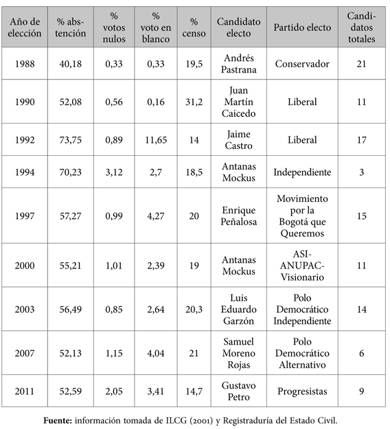 De acuerdo con la literatura, los comicios en Bogotá se han caracterizado por altos niveles de abstencionismo, así como por la pérdida de fuerza de los dos partidos políticos tradicionales (Liberal y Conservador) y por el voto fraccionado[3] (Instituto para el Desarrollo de la Democracia Luis Carlos Galán 2001). Igualmente, la pluralidad partidista y la falta de control de estas agrupaciones sobre sus afiliados se hacen evidentes en la postulación de varias candidaturas desde un mismo partido[4] y en la participación de candidatos con movimientos políticos ad hoc o por fuera de los partidos de origen, con el propósito de que su imagen personal les permita eludir el desprestigio de las organizaciones políticas tradicionales.[5]