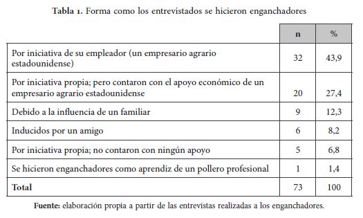 Muchos empresarios agrarios convencen a trabajadores de confianza del propio rancho para que recluten a sus paisanos y de esta forma les inducen a involucrarse en una actividad ilegal: el tráfico de personas (Izcara Palacios 2013 y 2014b). Como aparece reflejado en la tabla 1, la mayor parte de los entrevistados se hicieron enganchadores debido a la influencia de un empresario agrario estadounidense. Un 44% de los entrevistados aceptaron la petición de su empleador para suministrarle mano de obra indocumentada debido a un sentido del deber y solidaridad hacia él, porque este les ofreció el puesto de capataz, o porque necesitaban dinero para hacer frente a nuevos gastos. En un 27% de los casos fueron los entrevistados quienes dieron el primer paso y decidieron ayudar a otros amigos, parientes y paisanos a llegar a los Estados Unidos; pero si no hubiesen contado con el apoyo económico de un empresario agrario estadounidense no se hubiesen involucrado en esta actividad con tanta intensidad.