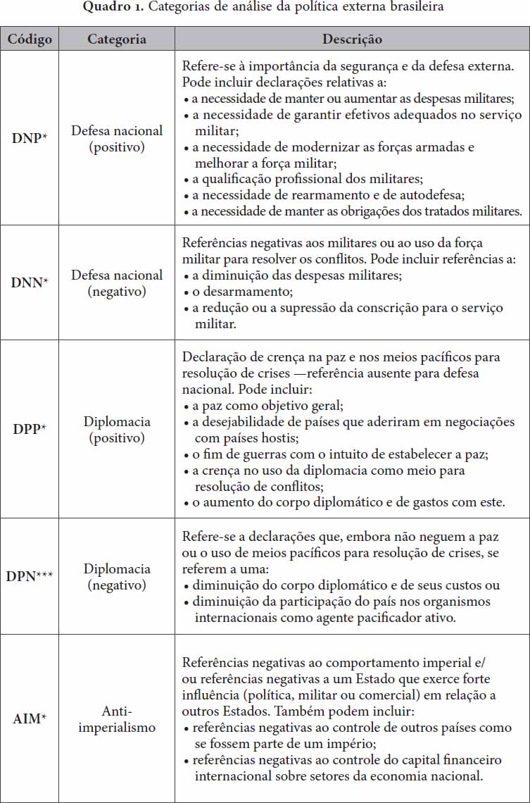 As categorias em que as sentenças foram classificadas foram definidas por meio de um modelo misto (quadro 1), isto é, algumas delas foram definidas antes da exploração do material, e outras se formaram no decorrer dela. As que foram definidas a priori fazem parte do esquema de classificação do projeto Manifesto Research on Political Representation (MARPOR), grupo de pesquisa sediado em Berlim que se dedica à análise de manifestos partidários. Mas, na medida em que o conjunto de categorias do domínio relações exteriores desse método foi insuficiente para lidar com todas as questões de política externa, bem como para tratar das especificidades da política externa brasileira, algumas categorias foram adaptadas, e outras criadas com essa finalidade. As categorias utilizadas neste estudo podem ser consultadas no quadro abaixo.