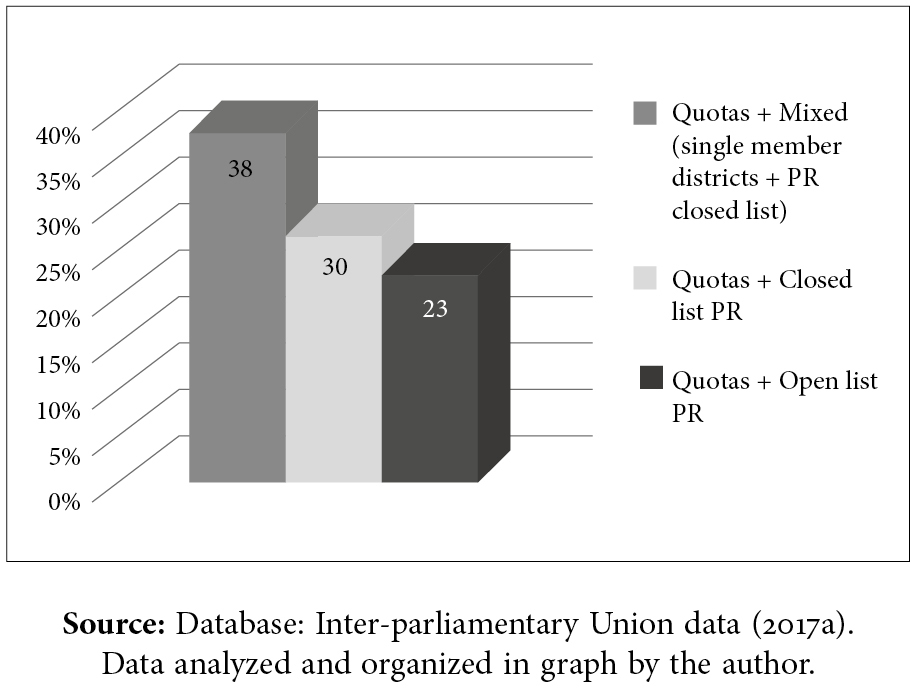 Studies of Latin America have confirmed that the electoral system plays a central role in the successful candidacies of women and, in turn, is in agreement with studies on a world level. However, they have found that not all PR systems are equally women-friendly. In terms of electing women, PR works best when it is linked to closed-candidate lists (Baldez 2004; Htun and Jones 2002; Htun and Piscopo 2010; Jones 2009). Jones (2009) reported a considerable variation in the electoral results of women in Latin American countries which used PR. In countries that used quotas and had a closed list PR system, women won 30% of the seats. In countries with quotas but an open-list PR system, the figure was 22%. In countries without quotas and an open-list PR system, it was 13%; and lastly, in countries without quotas and a closed-list PR system, it was 10%. This suggests that in order to understand the electoral performance of women it is necessary to look beyond the type of electoral system, and examine the model of electoral lists.