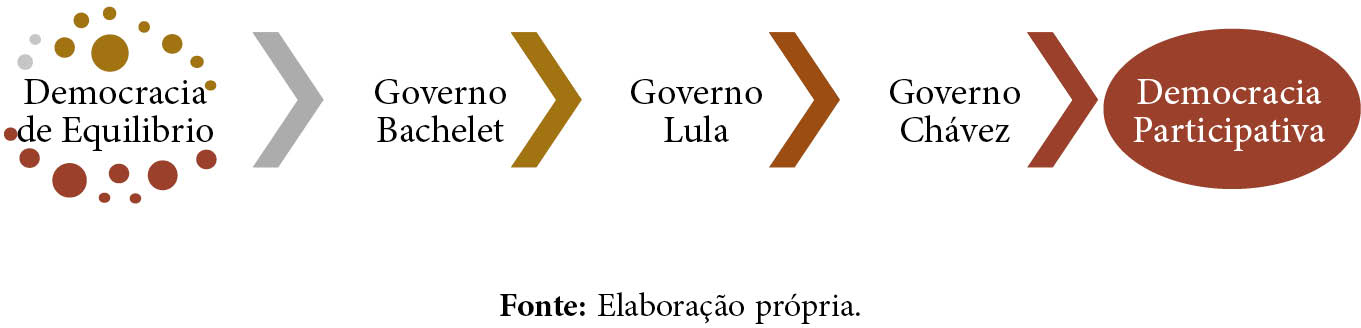 Ao comparar os avanços da democracia nos três governos de esquerda, a partir de um gradiente que vai da “democracia de equilíbrio” (democracia liberal procedimentalista) à “democracia participativa”, teríamos a seguinte figura: