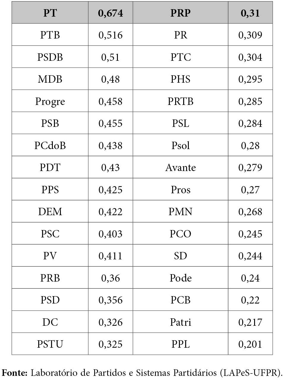 A interpretação dos dados de estrutura organizacional se dá apenas comparativamente. Apesar de o indicador variar de zero a um, não há um modo de dizer que os partidos são mais ou menos estruturados em absoluto ou abstrato. A pontuação é sempre relativa ao país e ao tempo em que as legendas se inserem. Ocorre de forma relativa, já que a distribuição de forças, como filiados ou diretórios, é estratégica e depende da competição com os pares. Portanto, o que podemos ver na tabela 1 é uma ordenação simples e decrescente dos partidos políticos brasileiros no ano de 2014. Observa-se que não há um grande bloco de partidos estruturalmente fortes e outro de partidos fracos. Há um continuum em que o partido mais estruturado, o PT, possui mais do que o triplo do último colocado, o PPL. Com exceção do PT em relação aos demais, não se nota diferença de mais de um décimo no indicador de estrutura organizacional.