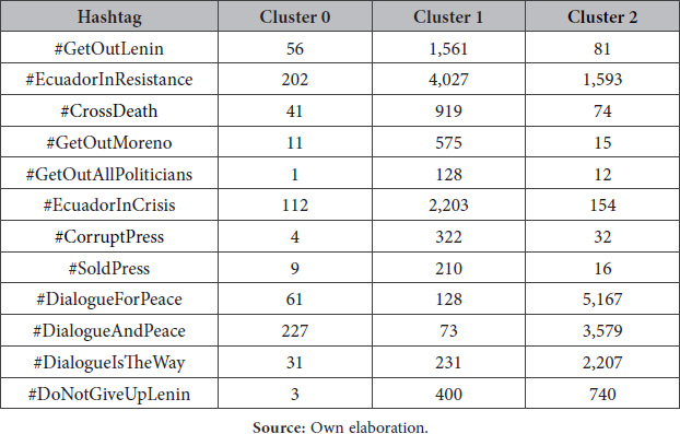 A heat map allowed us to visualize the frequency with which users combined two hashtags in the same tweet. It was easier to select the tweets of greatest interest from this visualization since the most combined hashtags appeared in them during the protest. Then, we proceeded to a qualitative analysis of them, which showed that 92% of the tweets containing the hashtag #GetOutLenin belong to Cluster 1 (against the government). Something similar occurred with the hashtag #GetOutMoreno, because 96% of the tweets that contained it were classified as belonging to Cluster 1. On the other hand, #DialogueForPeace, #DialogueAndPeace, and #DialogueIsTheWay were used by people supporting government stability (Cluster 2).