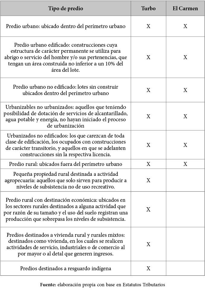 Durante el periodo de estudio, el Concejo Municipal de Turbo expidió dos estatutos tributarios, uno en 2002 (Acuerdo 004 del 11 de abril) y otro en 2009 (Acuerdo 010 del 8 de diciembre). El Concejo de El Carmen expidió uno en 2001 (Acuerdo 05 del 10 de diciembre). Estas regulaciones determinaron los cobros del predial con base en una tipología que, si bien tiene variaciones, se basa en una distinción básica entre predios urbanos y rurales. Nos centramos aquí en estos últimos.