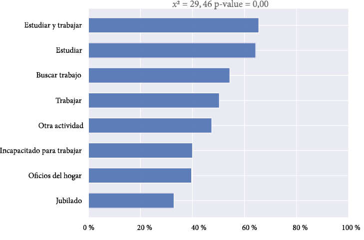 En cuanto a la actividad de las personas, en el gráfico 2 se puede establecer una asociación significativa con la intención de voto. Los estudiantes, incluidos quienes estudian y trabajan, tienen una mayor preferencia por Petro, mientras que las personas jubiladas y las dedicadas a las labores del hogar muestran menor apoyo hacia él.