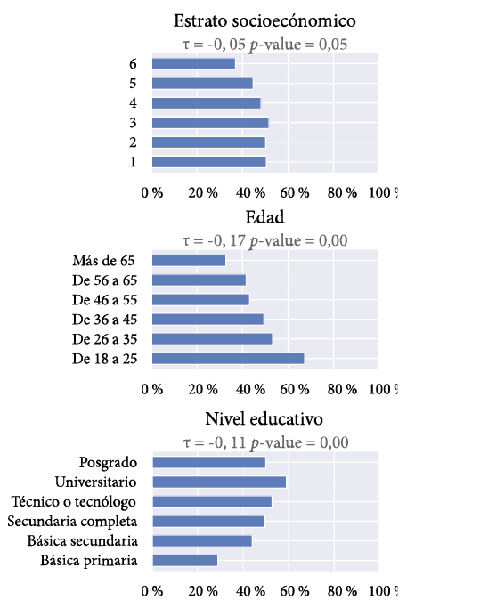3 Con este objetivo utilizamos la prueba chi-cuadrado de Pearson, para las variables nominales, y tau de Kendall (1938), para las variables ordinales, entre las cuales se encuentran las opiniones políticas.