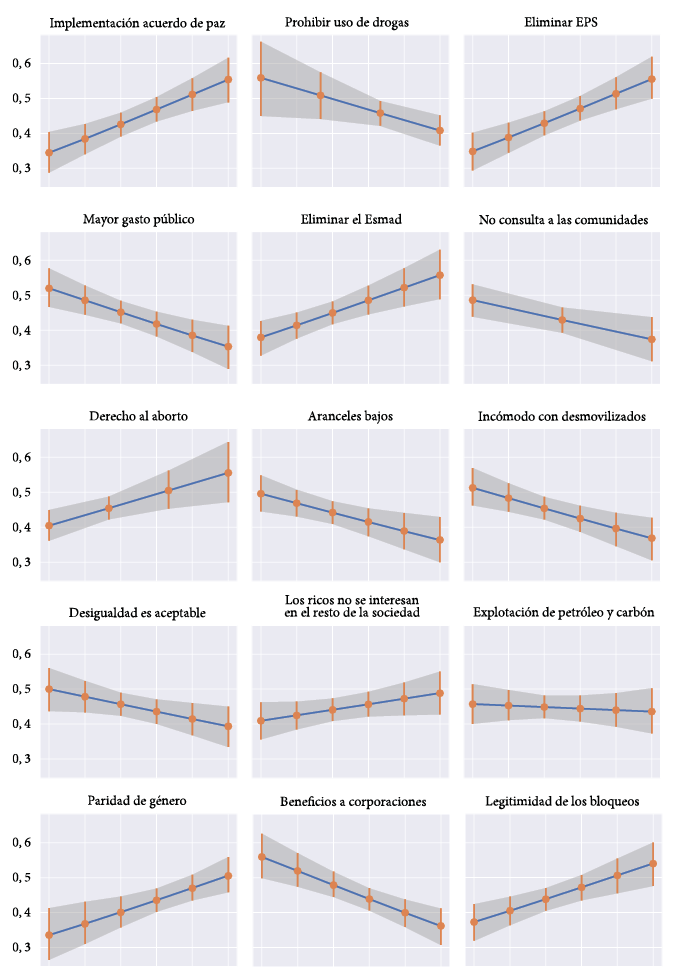 En resumen, observamos que, entre los temas sociales y económicos de campaña, la intención de voto por Petro aumenta fuertemente a medida que aumenta el apoyo por la eliminación del Esmad, por disminuir el papel de las EPS, por la implementación del proceso de paz, por la legitimidad de los bloqueos durante las protestas, por la inclusión de cuotas de género en las empresas y por el derecho al aborto. Al mismo tiempo, la intención de voto disminuye ampliamente al aumentar el apoyo a la criminalización de las drogas, el rechazo a los desmovilizados y el rechazo a los beneficios a las grandes corporaciones, y al disminuir el apoyo por aranceles altos. En contraste, se observa gráficamente que la intención de voto por Petro cambia solo levemente en algunos temas centrales del discurso tradicional del candidato, como por ejemplo la desigualdad y el papel de la élite económica en el desarrollo. Sorprendentemente, continuar la explotación de petróleo y carbón no provoca una diferencia importante de intención de voto por el candidato.