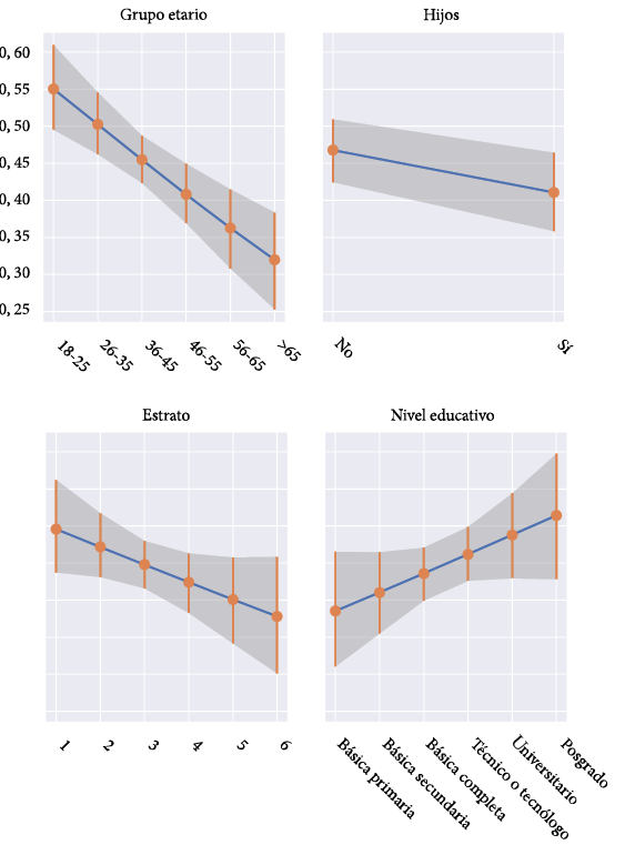 Como lo indica el gráfico 5, frente a las características sociales y personales, observamos que la intención de voto por Petro cae fuertemente al incrementarse la edad de los votantes y también a medida que sube el estrato, aunque no de manera tan pronunciada como pasa con la edad. Asimismo, observamos que también se incrementa la probabilidad de votar por Petro si aumenta el nivel educativo.