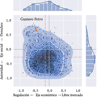 En el gráfico 6 es posible observar que los votantes del país se distribuyen ampliamente entre los cuadrantes 3 y 4 (autoridad-regulación y autoridad-libre mercado). Frente a ello, el grupo más significativo prefiere la intervención del Estado en la economía al tiempo que busca orden y autoridad (cuadrante 3). Paralelamente, el cuadrante 1 se encuentra relativamente menos poblado y contiene a las personas que apoyan la intervención del Estado en la economía, al tiempo que defienden los derechos individuales. Finalmente, el cuadrante 2 resulta ser el menos poblado y es el que contiene a aquellos votantes que prefieren tanto las libertades individuales como las económicas.