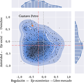 Con el resultado obtenido de las respuestas del cuestionario enviadas por la campaña de Gustavo Petro, ubicamos la posi ción del candidato en el cuadrante 1, lo cual se interpreta como una preferencia por la intervención del Estado en la economía y la defensa de los derechos individuales por encima del orden y la autoridad, tal y como se observa en el gráfico 6. Resulta muy interesante que el candidato se encuentre alineado con las preferencias económicas del promedio de sus votantes, pero alejado frente a las libertades individuales.