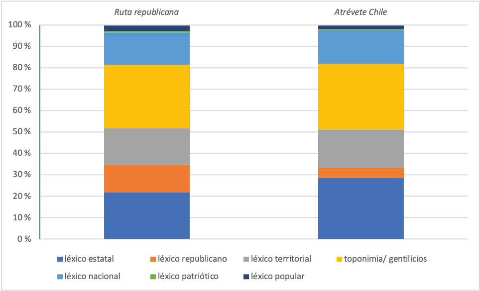 Frente al énfasis en un vocabulario nacional-popular e institucional en el partido Demócrata Cristiano, al predominio del léxico popular en el Partido Comunista de los sesenta o al marcado léxico nacional de la dictadura, hay en el discurso del Partido Republicano cierto predominio del vocabulario nacional —sobre todo, la designación toponímica de Chile y “lo chileno”—, aunado al léxico estatal y republicano, de modo que se acercaría al espectro terminológico de la UDI (partido matriz del Republicano). Aunque los republicanos se dicen herederos de las familias ideológicas del conservadurismo y el liberalismo, se observan diferencias con los vocabularios de esos partidos decimonónicos, en los que predominaba sobre el léxico institucional estatal un sentido moral patriótico republicano.