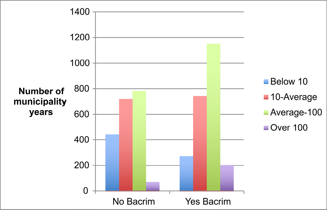 Post-demobilization criminal groups are predominantly urban, decentralized, and networked, and profit from multiple illegal and semi-legal activities, as occurs in Cali and Medellín. Some activities, like drug trafficking for export, have a long tradition, while others are old but have acquired more prominence, such as retail drug sales and extortion. Others are new, such as predatory loans known as “drop by drop” (gota a gota), where money is lent to locals with no collateral and disbursed quickly on the condition that they pay daily with high interest rates. Small-scale monopolies for food staples, such as milk, eggs, or alcohol, are also common. The groups’ electoral engagement is less clear than paramilitaries’ (Barrera 2018), but this does not mean they lack political implications or interests. There are also differences across groups; for instance, they are not all equally violent. As Figure 2 shows, between 2008 and 2013, among municipalities with criminal groups, 42 % displayed homicide rates below or equal to the national average, and 57 % had higher rates than the average. Lower homicides do not necessarily mean less violence (Durán-Martínez 2018) and can mask authoritarian social orders (Arjona 2016), but they signal different criminal behaviors.