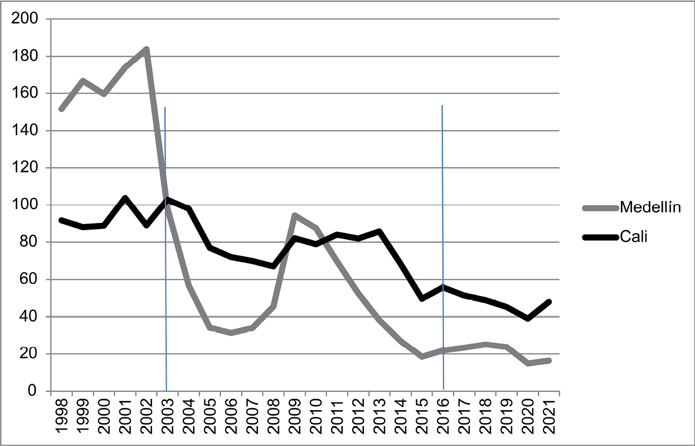 Connections between paramilitaries, drug traffickers, politicians, and state officials were strong, as exemplified in the network created by Senator Juan Carlos Martínez, connecting drug traffickers and paramilitaries (Revista Cambio 2011); however, the influence of paramilitaries in local administration was not as clear as in Antioquia and Medellín (Guzmán and Moreno 2007). Thus, these political connections were ineffective in deterring violence after the demobilization, also due to armed competition. Neither the state nor the criminals can generate effective mechanisms that reduce homicides. Persistent corruption that permeates the political class since before the paramilitary demobilization and goes back to the control of the Cali Cartel hinders policing, but protection networks are fragmented, so they also prevent armed actors from establishing a non-violent equilibrium. This instability also helps explain the trajectories after signing the peace agreement with the FARC. The FARC retained influence over time in Cali, and its dissident groups have a territorial presence alongside the ELN insurgency and new and older criminal groups (Indepaz 2022). Besides complex social conditions that are beyond this article’s scope to explain, this lack of control generates more violence in the post-FARC accord period than in Medellín, while low-level criminal governance persists. This creates risks for those who demobilized and supported the peace agreement with the FARC and more conflict among criminal groups and those who remobilized. Cali is among the top ten municipalities where social leaders (10) and signers of the peace agreement have been murdered and where massacres (7) have occurred since 2016 (Indepaz 2023).