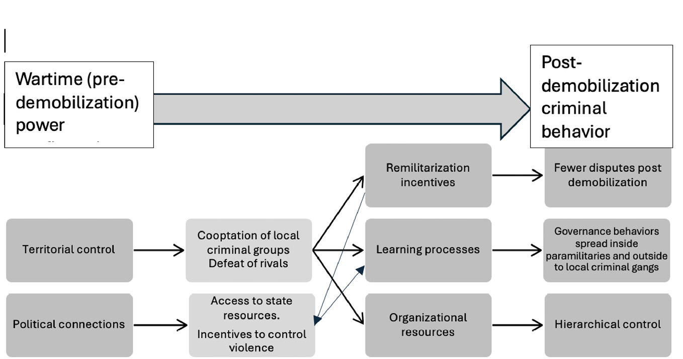 Existing literature considers multiple dimensions of non-state governance activities such as taxing (extortion), justice provision, or policy-making engagement (Arjona 2016; Arias 2017; Lessing 2020; Skarbek 2014). I operationalize post-conflict criminal governance focusing on the scope of social control, ability to regulate violence, and behavior of lower criminal ranks. These three dimensions represent key characteristics of non-state governance: regulation inside and outside the group and whether rules imposed by criminal groups affect civilian life (Lessing 2020). Criminal governance in a post-conflict scenario is higher when the scope of social control is high, groups can regulate violence if they wish to do so, and lower ranks behave more predictably. By contrast, low social control, less ability to regulate violence, and uncontrolled behavior by lower ranks characterize lower levels of criminal governance. Between these two poles, there is variation depending on whether populations see governance as legitimate and how many arenas of social and political life are controlled (Arias 2017; Lessing 2020). I focus on whether governance is intensive (or higher) or not, recognizing that the variation is wider. In general, higher governance means more predictable—but not necessarily more benign—behavior and a greater ability to regulate organizational and social affairs. I argue that wartime power configurations, in particular, the level of territorial control and political connections the demobilized group—in this case, the paramilitaries—had, shape criminal behavior after conflict by influencing incentives to fight or remilitarize, learning processes, and organizational resources through which criminal groups operate. Territorial control refers to whether power disputes existed during wartime among conflict actors and between those actors and criminal groups. Territorial control can change throughout a war; thus, my focus is on the existing balance of power at the time of demobilization, even though, as the case studies show, the specificities of the paramilitary expansion connect to longer historical patterns.