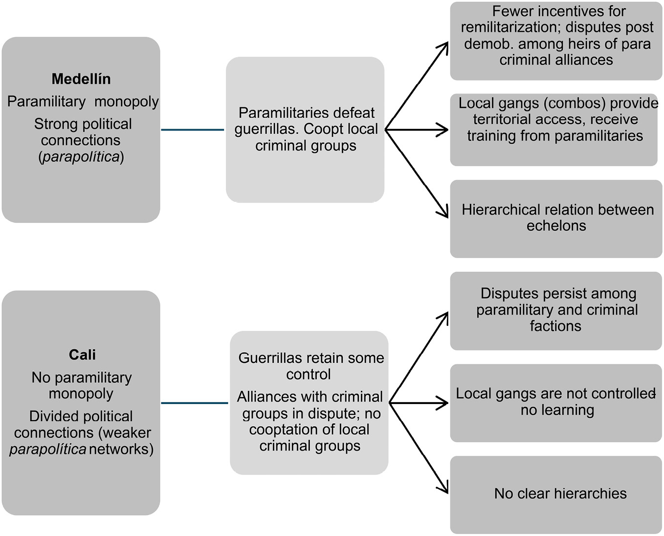 This article characterizes post-conflict criminal behavior drawing on the concept of criminal governance, that is, characterizing criminal groups’ ability to regulate behaviors outside and inside the organization (Lessing 2020). While some groups engage in criminal governance, others do not. I aim to explain this variation after the paramilitary demobilization. I argue that variation in criminal behavior can be path-dependent and is linked to the wartime power balance, specifically, the level of territorial control and political connections armed groups had before demobilization. The existing literature acknowledges that wartime orders shape incentives to remilitarize and organizational resources after conflict; nevertheless, I introduce a novel mechanism connecting wartime orders and criminal behavior—the learning processes among members of the demobilized group and those peripherally involved in the war. Where territorial control and political connections of paramilitaries before demobilization were high, criminal structures post conflict were likely to engage in governance. By contrast, disputed territories during wartime were less likely to generate criminal governance after conflict. While extant literature recognizes that wartime dynamics shape the post-conflict period, it focuses on former combatants’ behavior. This article contributes to understanding post-conflict, showing that analyses should consider behaviors and relations of armed actors beyond the group that demobilizes. It also contributes to a growing literature on criminal governance, demonstrating that long-term trajectories help explain criminal behavior. In other words, such behavior can be partially path-dependent due to complex learning processes that unfold over time. This does not mean that order always breeds order and vice versa. The analysis will show, instead, that at specific junctures armed structures reorganize in ways that facilitate the spread of learning processes and the connection across levels of criminal networks, which, in turn, can break or reinforce existing behaviors among and within groups. In Cali and Medellín, different processes unfolded when paramilitaries entered these cities. Paramilitary know-how and organizational resources were carried through key individuals (such as mid-level commanders), but also through gangs and other criminal groups.