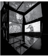 ¿Qué contiene el Biomuseo? Con excepción de algunos especímenes minerales, el museo no aloja ninguna colección, sino una serie de paneles, pantallas interactivas e instalaciones que ilustran la metáfora del puente de vida que singulariza al país. El “Pananorama” y “El Gran Intercambio” son las galerías más representativas de la esfera mediática en la que opera la museografía (figs. 8, 9, 10 y 11). La primera es un montaje de nueve pantallas que cubren tres paredes, el cielo raso y el piso. El visitante es ubicado en el centro del escenario y con este efecto tridimensional se le muestran las áreas bióticas de Panamá a través de imágenes en movimiento (panorámicas, primeros planos) y de efectos sonoros (que mezclan percusión y sonidos provenientes del entorno natural en cuestión). El resultado es una orquestada administración del afecto hacia la diversidad biótica panameña.
