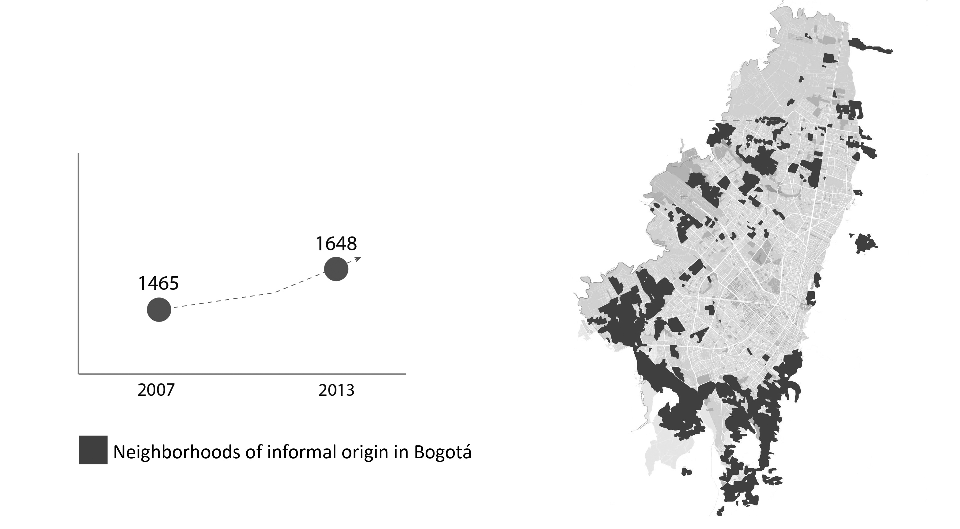 Al igual que en otras ciudades latinoamericanas, el desarrollo urbano de Bogotá ha estado marcado por procesos informales que son responsables de la consolidación de vastas áreas de la ciudad. En efecto, más del 20 % de la ciudad es el producto de procesos de construcción informal (fig. 2), que se encuentran en el origen de cerca de 1700 barrios.13