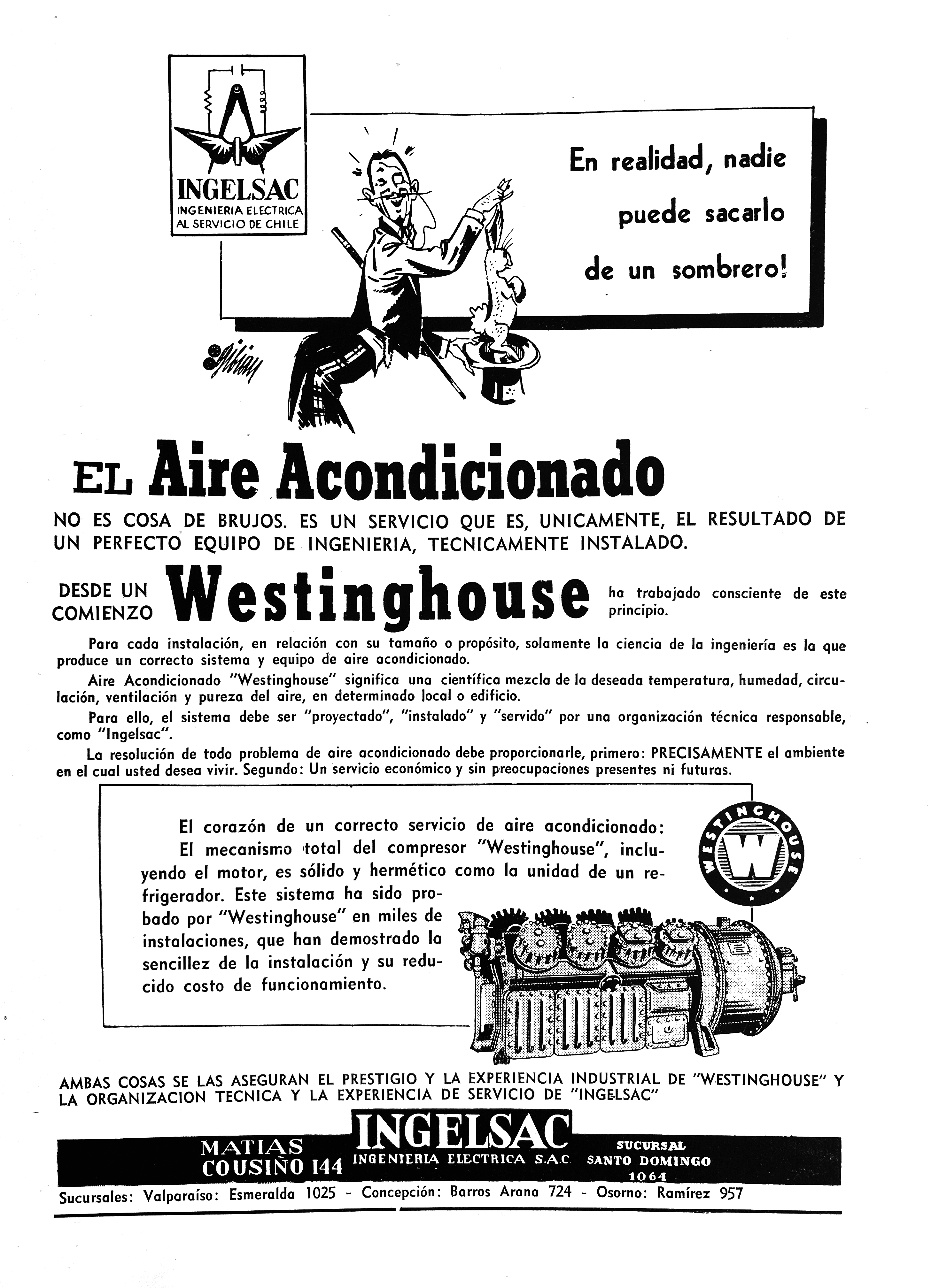 Aviso publicitario del compresor marca Westinghouse en el que se le asociaba con el corazón del sistema de aire acondicionado. Fuente: revista Arquitectura y Construcción (n.º 1, 1945).