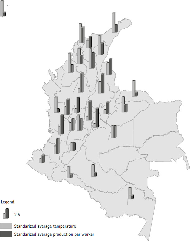 There is evidence that suggests a correlation between temperature and income in Colombia. This evidence is shown in Figure 1. In the map, one bar is worker output and the other is temperature. Most departments have one big bar together with a small one. Figure 2 illustrates a positive correlation between the competitiveness ranking6 and temperature (Sánchez & Acosta, 2001). This means that the departments that are ranked within the top five in Colombia (including Bogotá D. C., Valle, Antioquia) tend to have lower temperatures compared to Chocó, Córdoba and Sucre that are ranked last. Even if these are only correlations that do not represent causality, they suggest a strong effect.