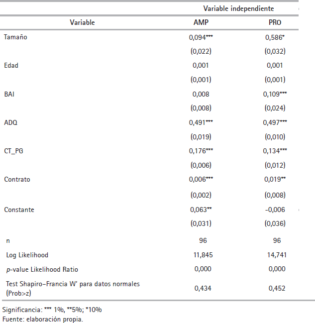 Como punto de partida, el análisis de la distribución de las variables dependientes revela que se comportan de manera normal. En la medida en que el test Shapiro-Francia no puede rechazar la hipótesis nula de normalidad en la distribución de los residuales, el análisis de regresión Tobit es válido. Además, es importante mencionar la estimación tipo clúster de los errores estándar, siendo el sector o grupo económico de pertenencia de las pymes la variable agrupadora. Esto con el fin de permitir la correlación intrasectorial en la estimación del parámetro.