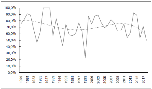 Los resultados del análisis se evidencian en la figura 1, donde se puede ver que, pese a la volatilidad y los cambios a lo largo del tiempo, el porcentaje de artículos que estudian la economía colombiana se mantiene en niveles muy altos a lo largo de la historia de la revista. La tendencia, según la línea de ajuste polinómica, se muestra oscilante pero no sufre fuertes ascensos o descensos. El pico de la medida se da a mediados de los años ochenta, donde el porcentaje de estudios sobre el país se mantiene en 100%, mientras que el punto más bajo de la tendencia se encuentra en 1999 con 22,2%, año en que se hacen invitaciones especiales a autores extranjeros y se publica un solo artículo sobre Colombia de los diez que componen los números 43 y 44, además de un corto texto de Santiago Montenegro, entonces decano de la Facultad de Economía, sobre la Escuela de Verano en Economía organizada por la facultad. Hacia los últimos años se encuentra una ligera tendencia a la baja pues en estos números solo la mitad de los artículos (50%) correspondían a estudios relacionados con el país. Sin embargo, la participación de dichos estudios en la revista se mantiene alta a lo largo de todo el periodo.