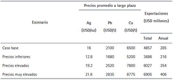 Si se asume que la cantidad de metal producido es la misma que el caso base, los ingresos por ventas (exportaciones) varían de acuerdo con los precios percibidos por la minera para cada metal. Los precios de los metales suben y bajan, por lo que es necesario considerar ambos escenarios. Al mantener fijos costos de tratamiento y comercialización, se examinan ingresos por exportaciones a la minera en tres escenarios posibles: “precios elevados”, “precios muy elevados” y “precios inferiores”. Los dos primeros se construyeron mediante la simulación de una tendencia alcista al elevar el precio promedio de cada metal en un 20 % y un 35 %, mientras que para el tercero se redujo el precio de cada metal en un 20 % con respecto al caso base, según se puede observar en la Tabla 3.
