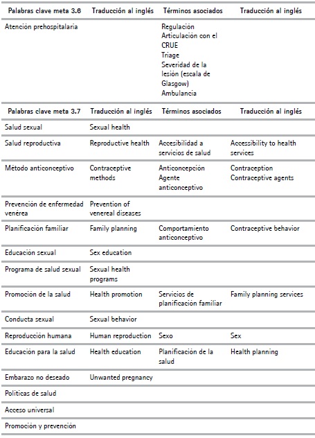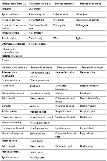 Para evaluar la producción intelectual (trabajos de grado y tesis) con respecto a los ODS, se realizó una selección de términos o palabras clave tanto en español como en inglés por cada meta del ODS. Este proceso se realizó utilizando las opciones keywords de los recursos científicos Web Of Science y Scopus, además de los descriptores especializados o tesauros de cada área del conocimiento, entre ellos MeSH y Decs para el área de la salud (MeSH, 2020)5 o el tesauro de la Unesco.