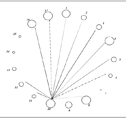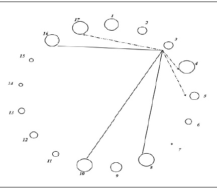 La Figura 5 presenta las interacciones entre los diecisiete ODS a través de los programas de responsabilidad social de las organizaciones de la muestra. Naturalmente, los 11 ODS principales son los nodos de los cuales salen las líneas hacia los ODS colaterales, con lo cual se indica que los asuntos relevantes de estos fueron incorporados en los programas de aquéllos.
