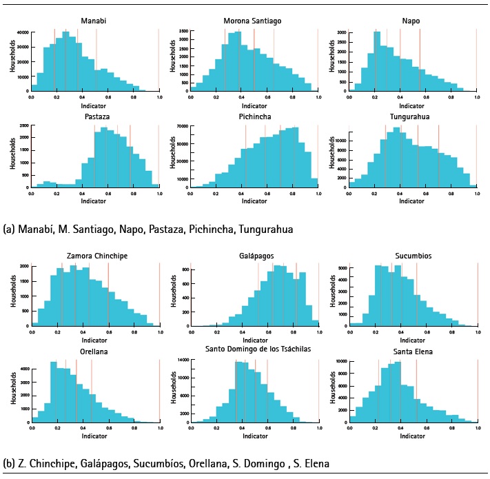 The kurtosis coefficient for Los Ríos, Orellana and Pastaza is greater than 3, which implies that the distributions of the indicator are leptokurtic; that is, households are concentrated in the average. In the rest of the provinces this coefficient takes values of less than 3, indicating that there is a small concentration of households around the average. As the coefficient of variation makes it possible to compare the relative dispersion of the socioeconomic indicators of provinces, the greatest dispersion of the socioeconomic indicator is observed in the provinces of Bolívar, Chimborazo, Cotopaxi, Loja and Manabí. This reflects that households within these provinces present greater variability than in the rest of the provinces. Finally, in Pichincha, Pastaza, Galápagos and Santo Domingo de los Tsáchilas there is less variability among households.