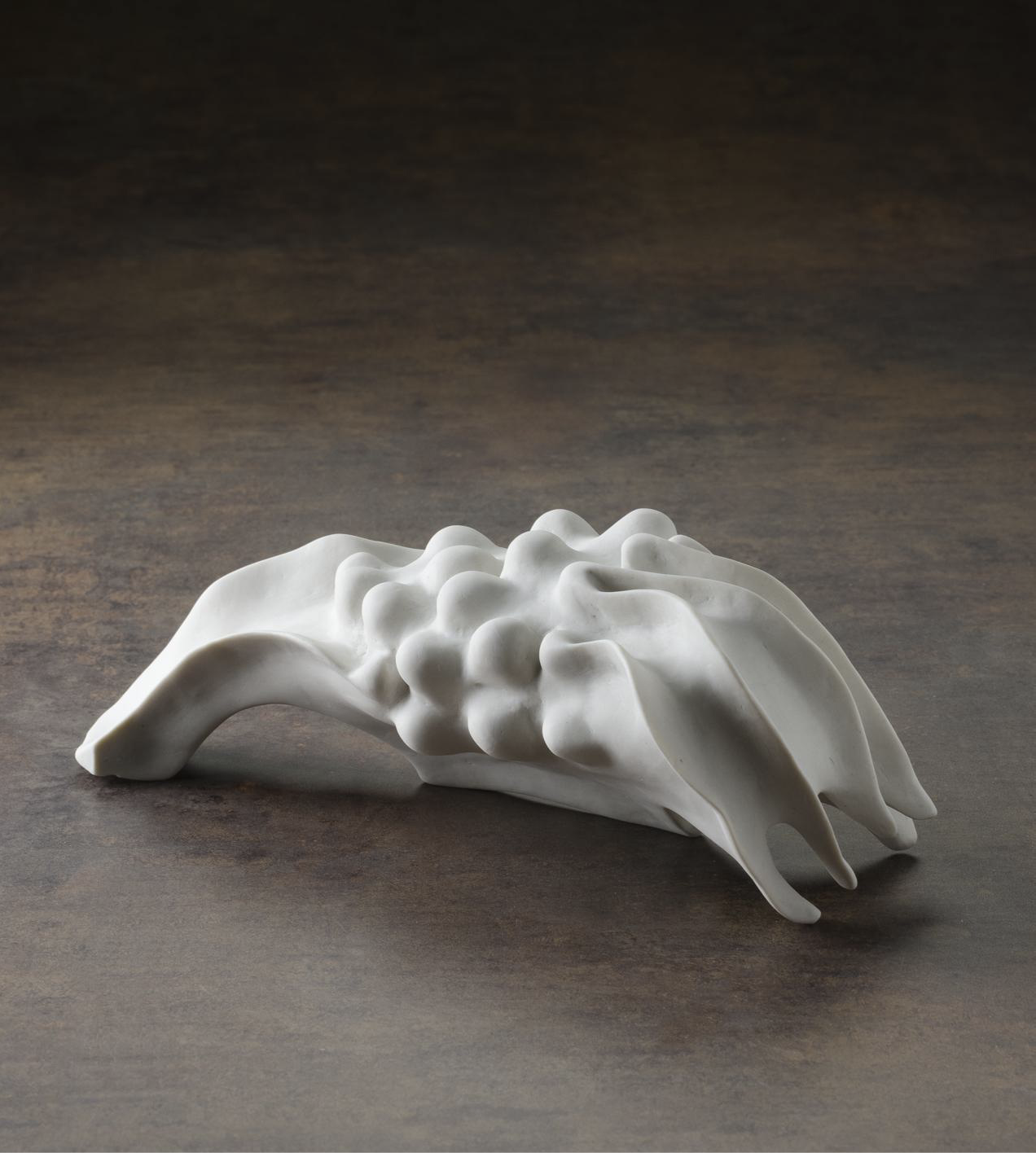 El encuentro con la porcelana ocurrió de manera fortuita, en paralelo temático con Animales Marinos, pues ambos representaban terrenos inexplorados para la artista. La porcelana, por su composición, requiere ser trabajada en una escala reducida y ofrece un acabado más refinado que la arcilla tradicional. Esta cualidad material es la que Lozano identifica cuando habla de “formas ondulantes y dinámicas; movimientos orgánicos, fugitivos, estructuras mutables, flexibles y blandas”;17 tal ligereza material confiere a las piezas un carácter más ágil, propiciado por la delicadeza y finura de la porcelana, haciéndola idónea para representar el mundo bajo el agua.