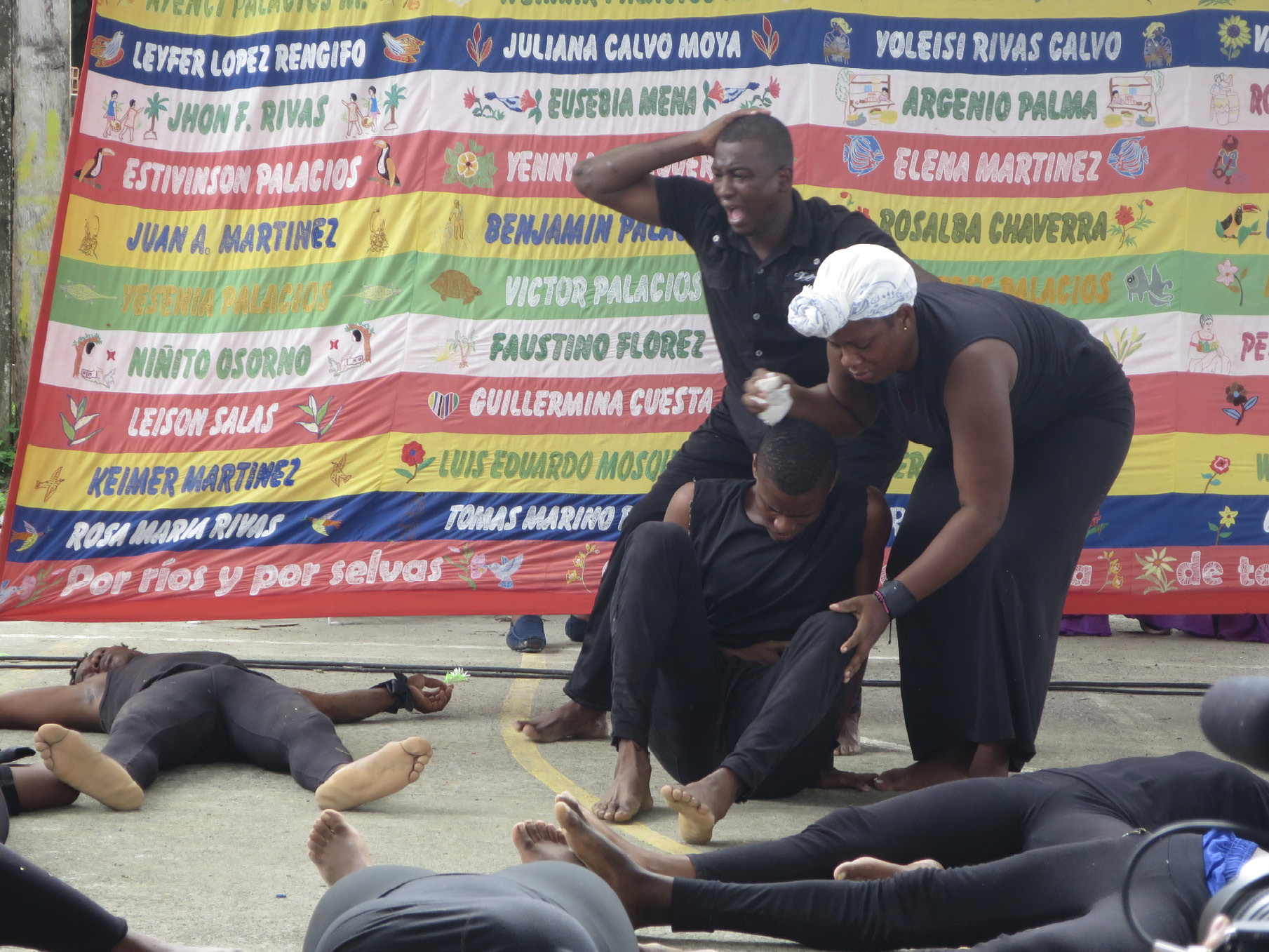 Los muertos han sido algunos de los principales protagonistas en los debates, tensiones, reclamos y luchas de los bojayaseños. Más que números o vidas perdidas, los sobrevivientes han narrado, mediante diferentes dispositivos, lo que ha significado el trato indigno que recibieron los cuerpos de las víctimas, la imposibilidad de despedirlos según la tradición mortuoria afro del Atrato y las implicaciones espirituales, cosmológicas, familiares y comunitarias que esto ha tenido.28 No es menor el hecho de que la obra de teatro creada para la primera conmemoración de la masacre tuviera a los muertos como núcleo narrativo. Esta obra fue una creación artística que permitió convocar, por primera vez, a un pueblo que aún no había podido despedir a sus muertos. Fue un encuentro ritual para comunicarse con ellos.