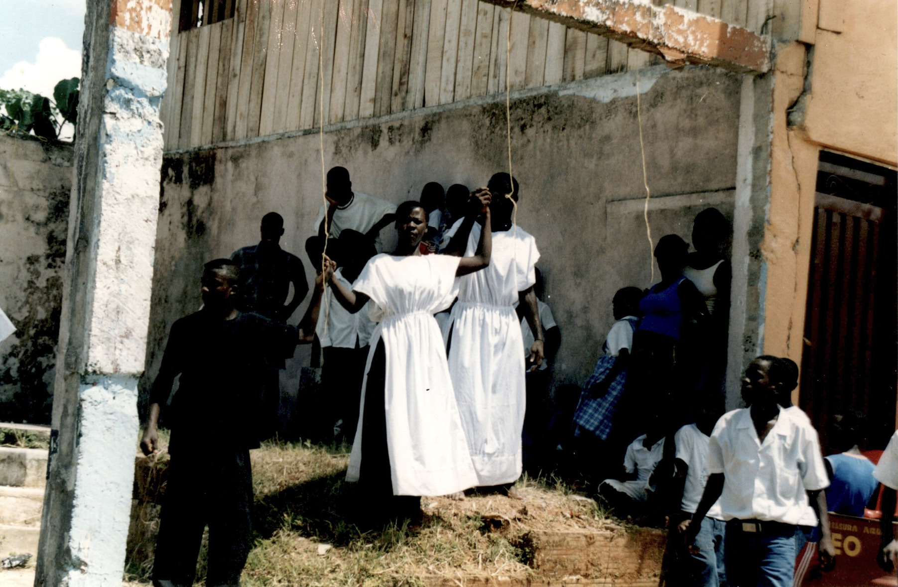 Los muertos hablan (2003) (Img. 2) fue creada para conmemorar el primer año de la masacre de Bojayá y presentada en el viejo Bellavista, teniendo como escenario las ruinas. En una de sus escenas centrales, los actores y actrices leen cartas escritas a familiares y amistades asesinados en la masacre. El público, aún conmocionado por el dolor reciente de la masacre, sintió el peso del duelo colectivo cuando, desde ese lugar de memoria convertido en ruina y escenario teatral, se escuchó la voz de sus muertos: “Somos los cimarrones, los campesinos, las mujeres, los ancianos, los líderes del pueblo, los padres y hermanos. Los que nos masacraron por defender nuestros derechos. Somos los niños y jóvenes negros e indígenas. Somos la selva. Somos la fuerza de la naturaleza. Somos de la tierra madre. Somos los muertos que hablan”.29