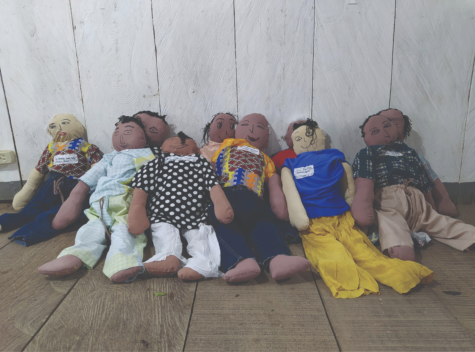 Para nosotras este fue un ejercicio muy significativo, muy sanador, y nos pensamos en hacer estas representaciones simbólicas porque, antes de que existiera la UBPD, las mujeres muchas habían denunciado su caso ante la Fiscalía, pero no hubo ninguna respuesta. Muchos de los casos fueron archivados. Otras mujeres no habían denunciado porque estaban en medio de los victimarios, de quienes fueron los responsables de la desaparición de sus familiares. Se recibían amenazas si denunciaban y las mujeres, por ese temor, no habían denunciado los casos de desaparición. Entonces, muchas nos decían que habían perdido la esperanza y estaban decididas a no seguir buscando; habían dado el caso por perdido. Pensando en esto, que salió justamente cuando estábamos construyendo el informe para la Comisión de la Verdad, dijimos: “tenemos que pensarnos una estrategia para revivir la esperanza de las mujeres negras frente a la búsqueda de sus seres desaparecidos”. Entonces, nos pensamos que cada una hiciera la representación de su familiar y compramos telas. Ese trabajo fue apoyado por la OIM y la Unidad de Búsqueda, que también estuvo desde el principio acompañándonos en este proceso. Compramos telas, rellenos y todo lo que se requiere para hacer un muñeco, que literal es un muñeco o muñeca dependiendo del sexo del desaparecido. Pero, por la forma peyorativa como los grupos armados utilizan la palabra muñeco cuando matan a alguien —“vayan recojan el muñeco” — no quisimos ver a nuestros desaparecidos en esta palabra y le dimos el nombre de “kutrús”. Le dimos ese nombre para resignificar lo que eso representa en algunos de nuestros territorios: el kutrús es una junta de sabios mayores, mayoras, que se organizaban en la comunidad para tomar una decisión importante. El kutrús hacía parte del derecho propio, de la justicia propia, esa que venimos exigiéndole al Estado. Así como se ha reconocido la justicia de los pueblos indígenas y la ordinaria, los pueblos negros hemos venido exigiendo el reconocimiento de la justicia propia. Esto es parte de lo que representa el kutrús. Inclusive, cuando se desaparecía a alguien en la comunidad, muchas veces se lo atribuíamos a mitos y leyendas: “se lo llevó la Tunda, la diabla”, si era mujer, “se la llevó el duende”, si era hombre, pero no, eran los grupos armados que ya andaban merodeando en nuestros territorios. Entonces, cuando se iba a organizar la búsqueda de alguien, se organizaba el kutrús. Si la que desa-parecía era mujer, entonces el padrino tenía que estar presente también enese kutrús, si el que desaparecía era hombre, la madrina tenía que estar presente, y todos los elementos espirituales, y se iban en la búsqueda de ese ser desaparecido. Cuando se encontraba la persona, lo que se hacía era cerrarel camino para que nadie más volviera a desaparecer por allí. Hoy el Sis-tema Integral para la Paz habla de la no repetición, para nosotros la norepetición era cerrar el camino. Entonces, hicimos esta representación simbólica, porque parte de la apuesta que tenemos desde La Comadre es hacer una exposición itinerante, poner a circular estas obras artísticas en distintos escenarios, espacios, no solo en Bogotá, sino en distintos territorios del país y ojalá a nivel internacional.23